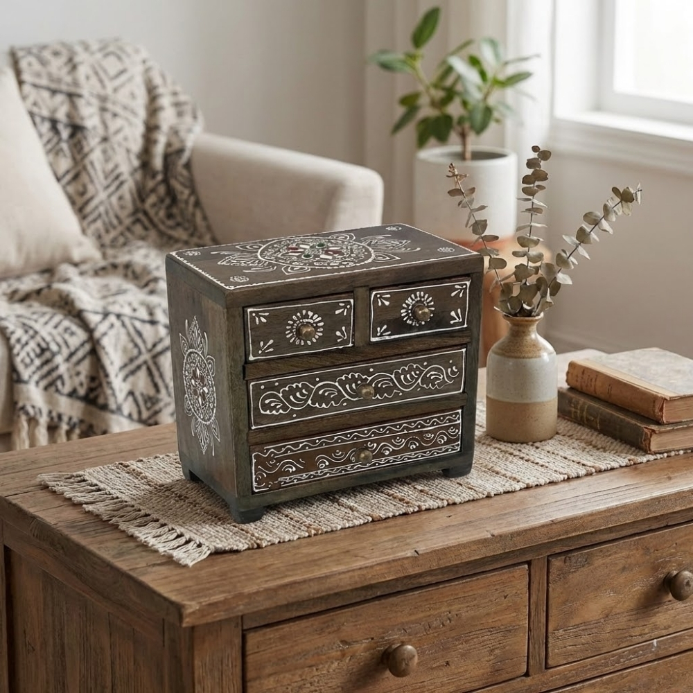 The AntiqueBloom Handcrafted Wooden Chest is crafted from solid wood and enhanced with delicate floral inlay artwork inspired by vintage Indian craftsmanship. Its compact multi-drawer design allows easy organization of jewellery, accessories, and small essentials. The aged finish and detailed patterns make it a timeless décor accent for bedrooms, living spaces, or entry consoles. Durable, functional, and artistically rich, this piece blends heritage charm with everyday utility.