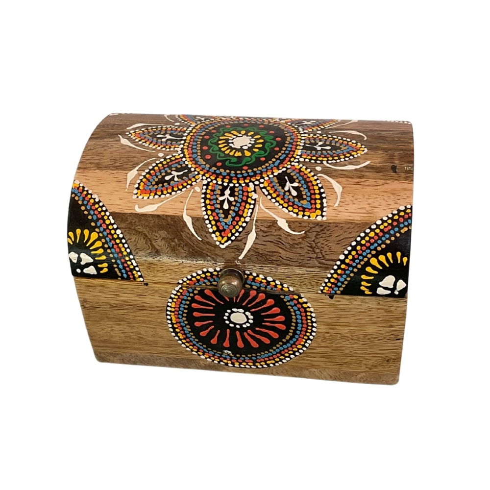 Handcrafted wooden box with vibrant mandala folk-art detailing. Perfect for jewellery, keepsakes, festive gifting, and elegant home décor.