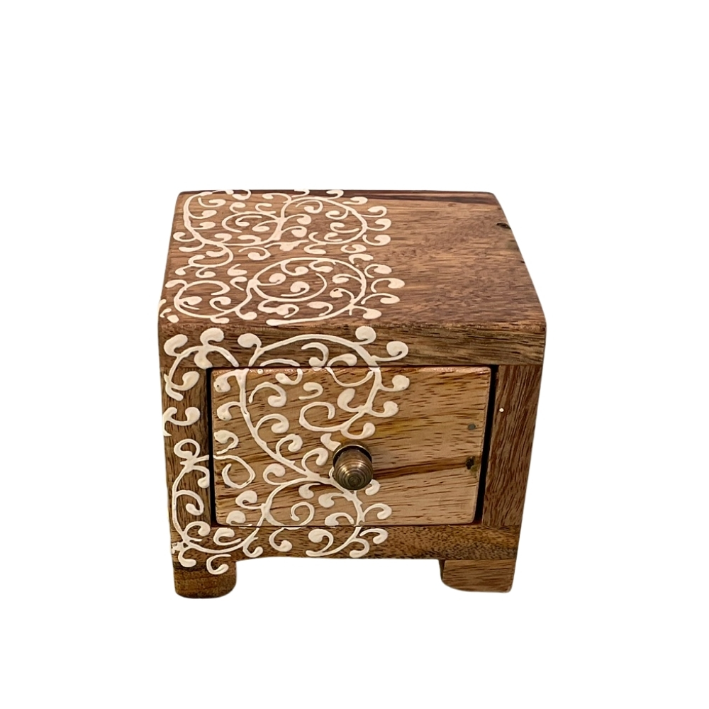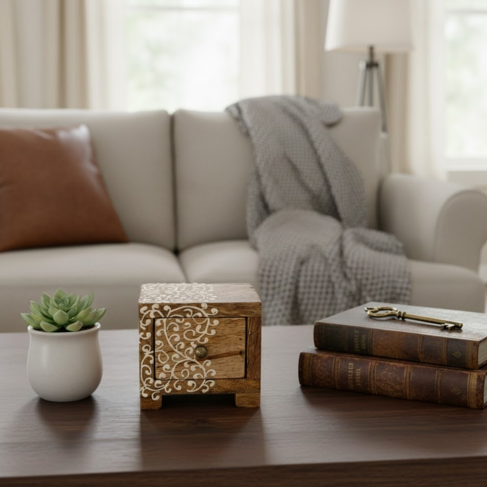 CarvedAura Wooden Side Storage is a handcrafted storage unit designed to fit effortlessly into modern living spaces. Built from high-quality wood, it features an intricately carved panel that adds visual depth and cultural richness. Its compact structure makes it ideal for side tables, desks, or shelves. The interior space is suitable for storing small essentials, valuables, or decorative items. The smooth finish enhances durability and ease of maintenance. Each piece is handmade, showcasing skilled craftsmanship and attention to detail. CarvedAura Wooden Side Storage is perfect for those who want subtle artistry combined with everyday functionality.