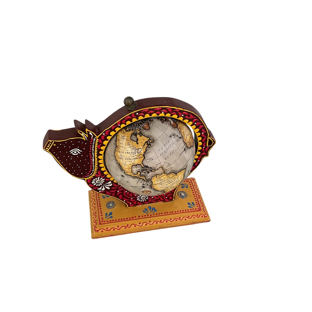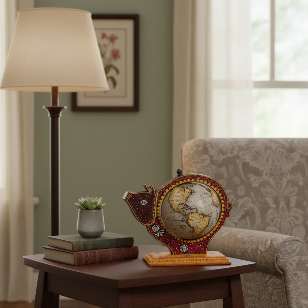 Classic Fish Globe Table Accent is a beautifully crafted décor piece that combines artistic creativity with global symbolism. Designed in the shape of a stylized fish, this unique showpiece holds a world globe at its center, representing prosperity, movement, and exploration. The detailed surface finish gives it a handcrafted, ethnic appeal that stands out instantly. Its compact yet eye-catching design makes it ideal for placement on study tables, office desks, bookshelves, or side tables. The globe features traditional map markings, adding an educational and vintage touch. The sturdy base ensures stability while enhancing durability. This décor accent blends effortlessly with both contemporary and traditional interiors. Perfect for décor enthusiasts, collectors, or as a thoughtful gift, this piece adds personality, charm, and cultural depth to any space.