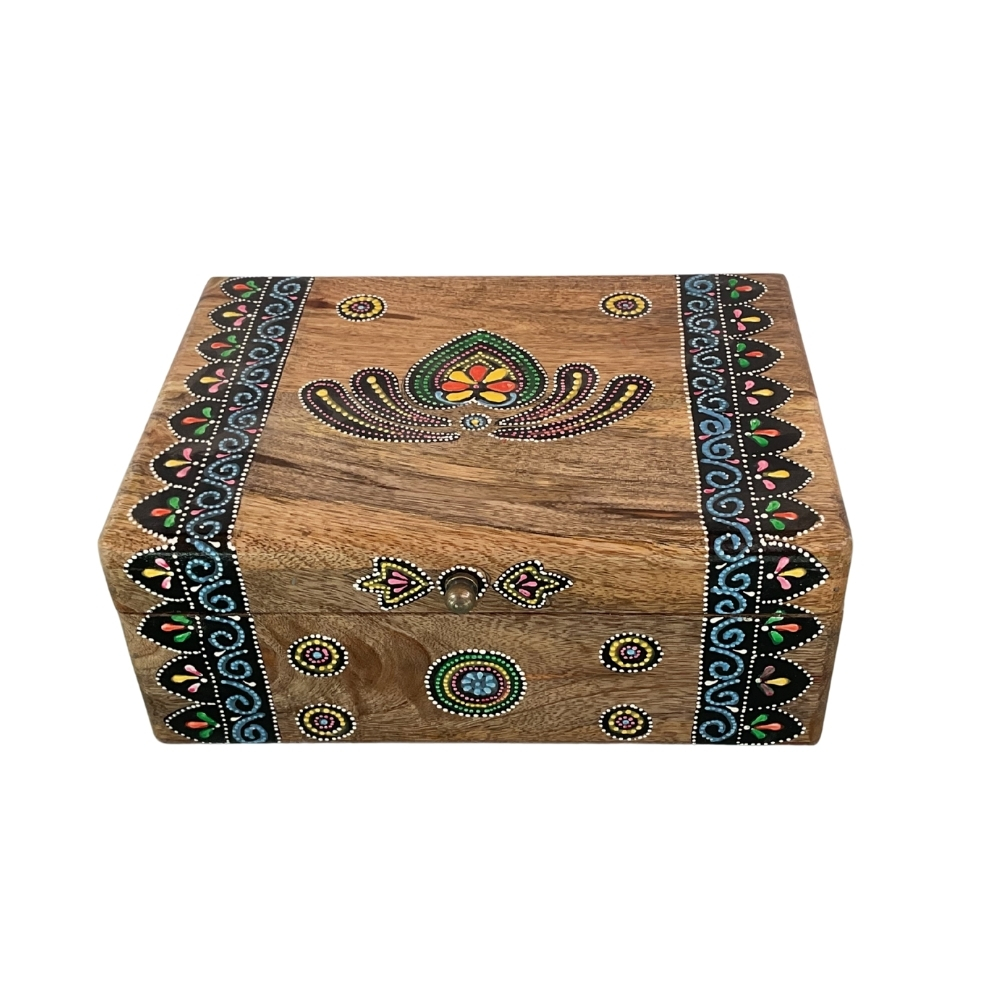 This wooden box is ideal for storing jewellery, bangles, accessories, pooja items, coins, or cherished keepsakes. Its bright ethnic charm makes it an excellent gifting option for Diwali, weddings, housewarmings, festivals, or return gifts. Each piece is handcrafted and hand-painted, ensuring a truly unique artistic character.