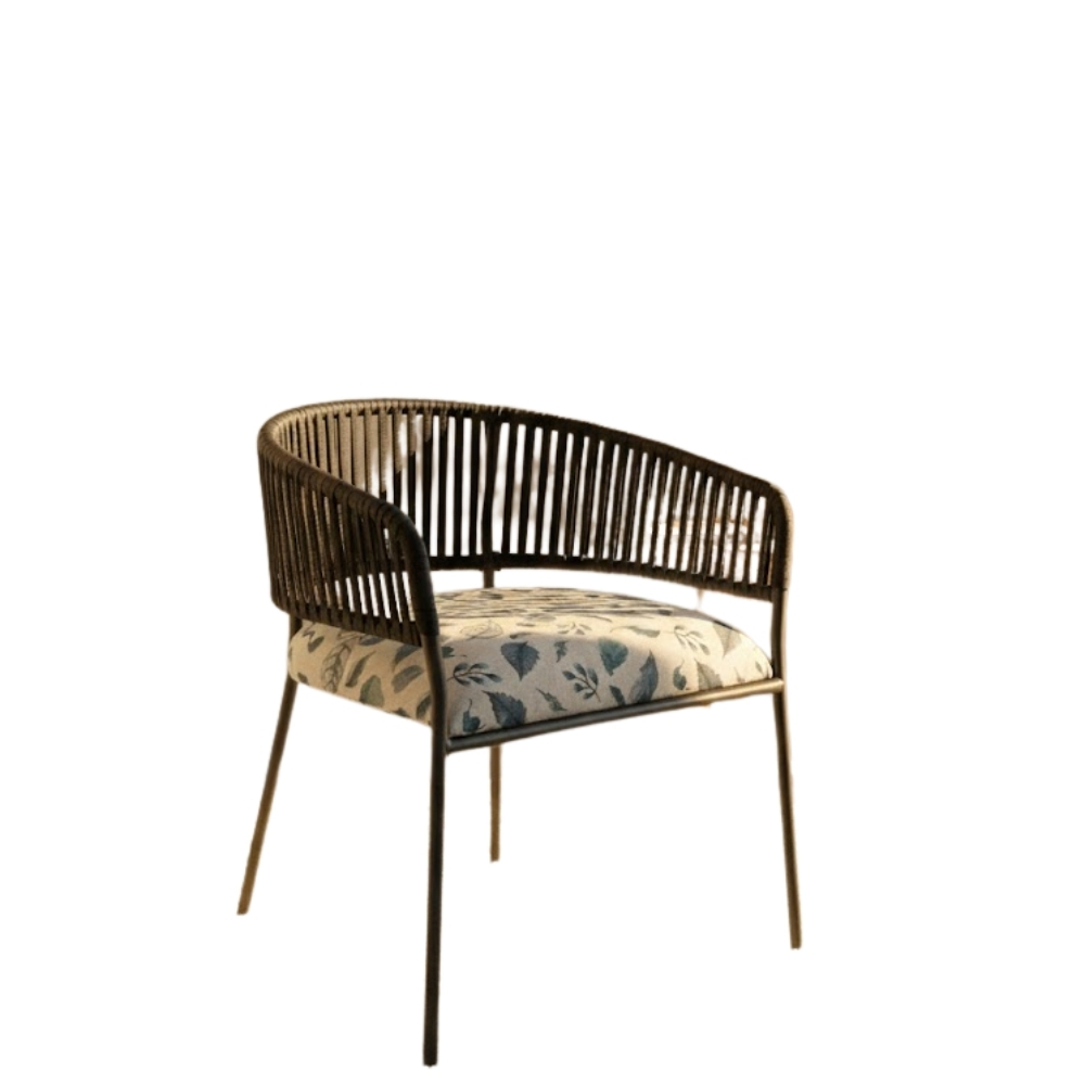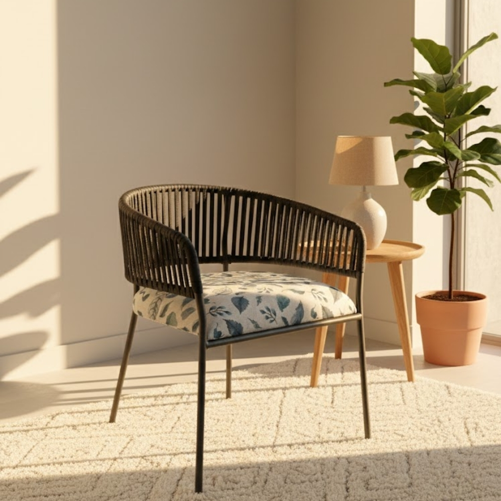 The Flora Weave Elegance Armchair combines artisanal weaving with soft upholstery to create a refined seating solution for premium hospitality interiors. With its curved woven back, botanical-patterned cushion, and slim metal legs, this chair delivers visual warmth and lasting comfort.