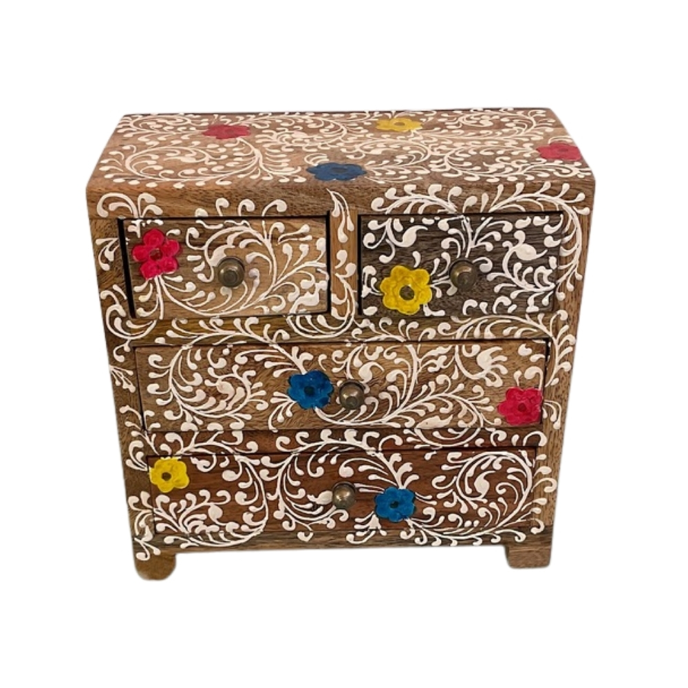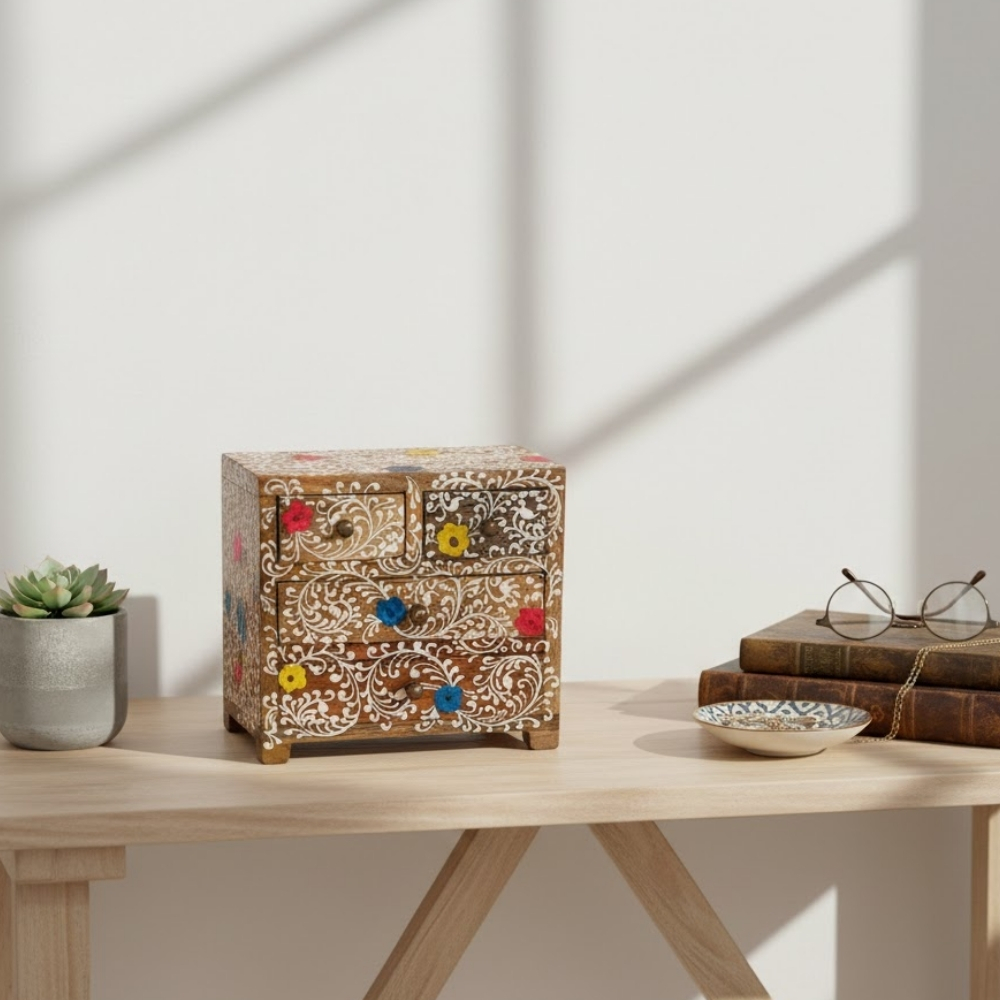 FolkCharm Wooden Keepsake Box is a handcrafted piece that showcases intricate folk-art detailing combined with functional storage. Crafted from high-quality wood, the box features hand-painted motifs accented with vibrant colors that bring life to its surface. The compact design makes it ideal for storing jewelry, letters, souvenirs, or small valuables. Its sturdy lid ensures secure storage while maintaining easy access. This box fits effortlessly into various interior styles, from contemporary to ethnic. Each piece carries unique artistic variations, making it one of a kind. FolkCharm Keepsake Box adds warmth, artistry, and cultural value to your décor.