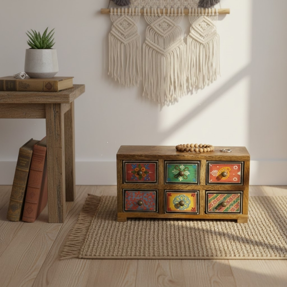 FolkGrid Wide Organizer offers ample storage through multiple drawers arranged in a broad layout. Hand-painted folk motifs enhance its visual appeal, while the sturdy wooden construction ensures durability. Perfect for storing accessories, crafts, or documents in style.