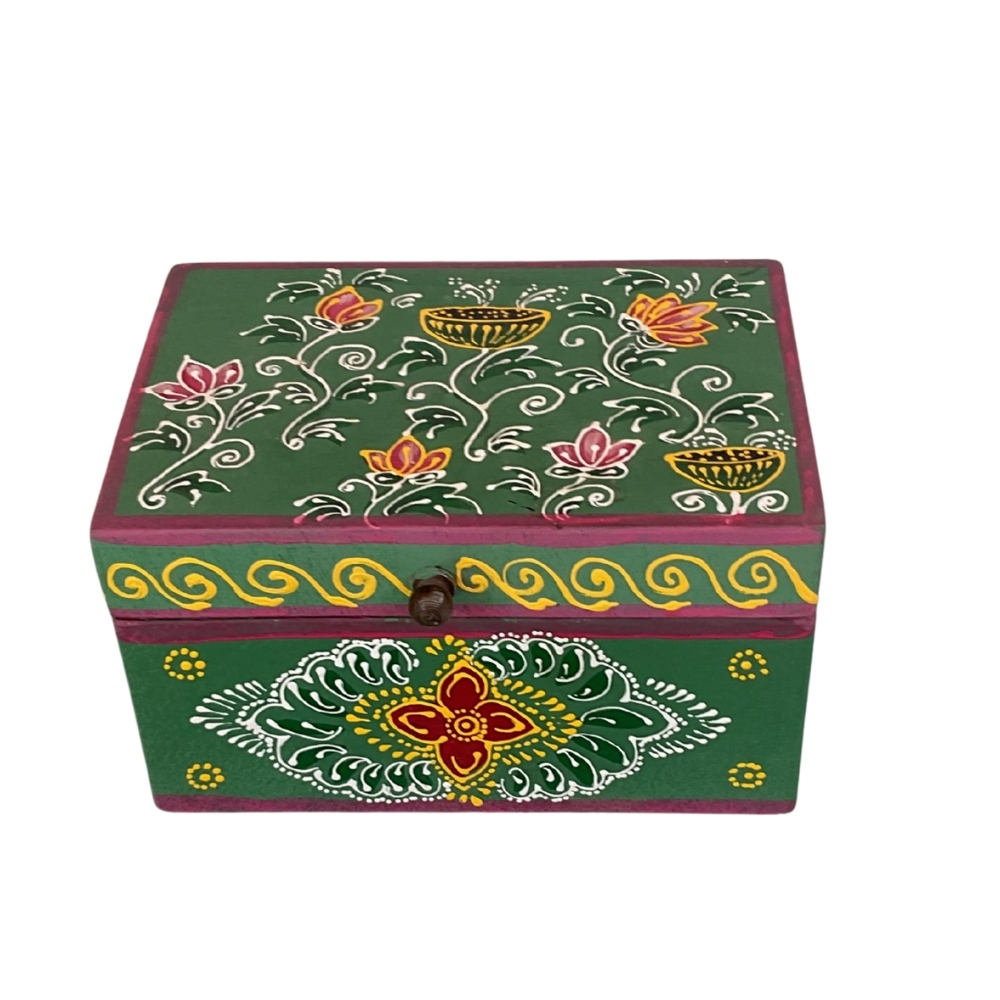 Handcrafted wooden box with rich green base and traditional floral folk-art detailing. Perfect for jewellery, keepsakes, festive gifting, and ethnic home décor.