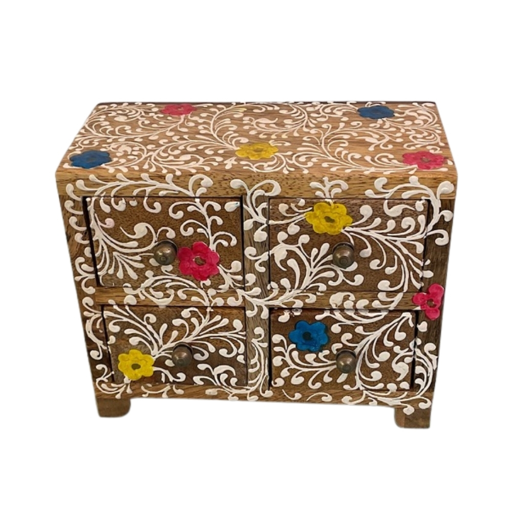 HeirloomDot Handcrafted Storage Box reflects the beauty of Indian folk traditions through its detailed dot-style hand painting. Crafted from high-quality wood, this box features a symmetrical pattern enriched with colorful accents that create a visually engaging design. The solid structure ensures long-lasting use, while the interior offers ample space for storing personal belongings such as jewelry, watches, letters, or small valuables. Its flat top allows it to double as a decorative accent on consoles, coffee tables, or study desks. The handcrafted nature ensures that no two boxes are exactly alike, adding exclusivity to every piece. Whether used as a gift box or a décor item, HeirloomDot Wooden Storage Box brings authenticity, craftsmanship, and artistic value into your home.