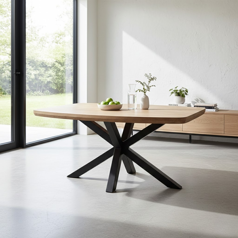 The Helios Round Dining Table features a smooth circular wooden top supported by a dynamic central base. Perfect for restaurants and dining areas that value both flow and elegance.