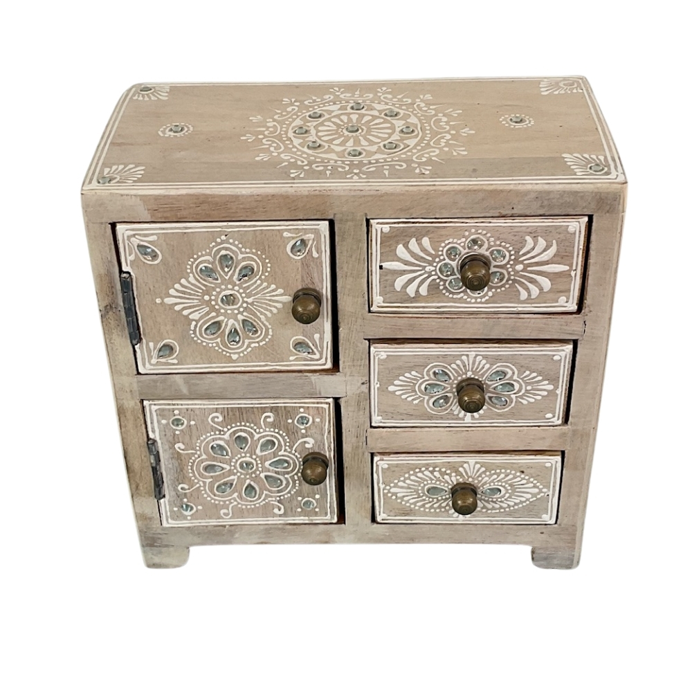 The HeritageCube Wooden Organizer is designed with multiple drawers to keep items neatly arranged. Handcrafted with traditional patterns, it blends utility with artistic beauty. A perfect storage solution for jewellery, accessories, or craft items.