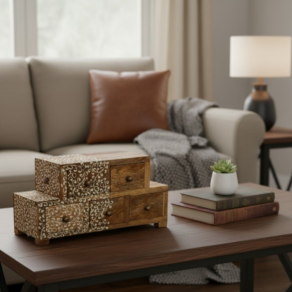 HeritageCurve Wooden Storage Chest is a beautifully designed piece that showcases traditional carving techniques on a compact wooden form. Crafted from durable seasoned wood, it features gently curved edges that enhance its visual appeal and softness. The carved detailing adds depth and character, making it a standout décor item. Its interior offers sufficient space for storing personal belongings, accessories, or keepsakes. The sturdy lid ensures secure storage while maintaining easy access. Suitable for bedrooms, living rooms, or study spaces, this chest blends seamlessly with both modern and classic interiors. Each chest is handcrafted, reflecting authenticity and skilled workmanship. HeritageCurve Wooden Storage Chest is ideal for those who appreciate fine details and traditional artistry.