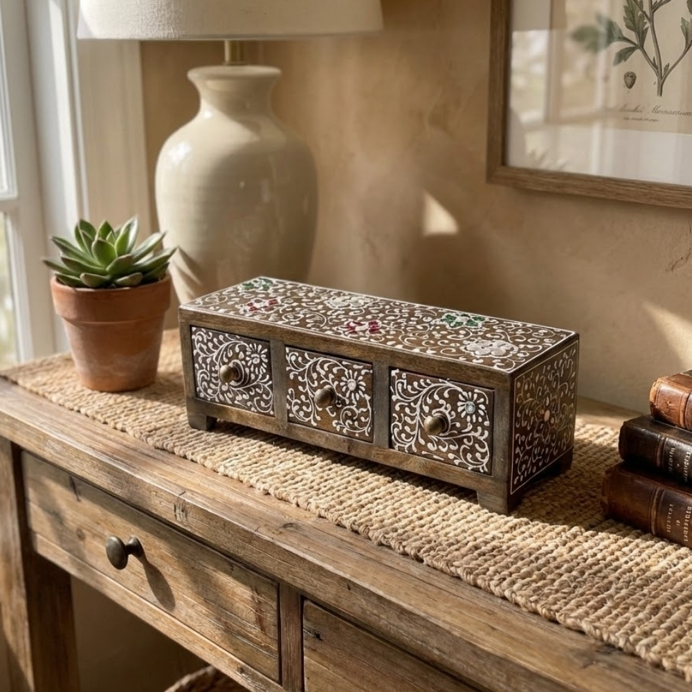 The HeritageLine Wooden Storage Box features an elongated form with finely detailed border artwork. Handcrafted from quality wood, it is ideal for storing watches, bangles, stationery, or valuables. The elegant proportions and handcrafted finish make it a refined addition to any room.