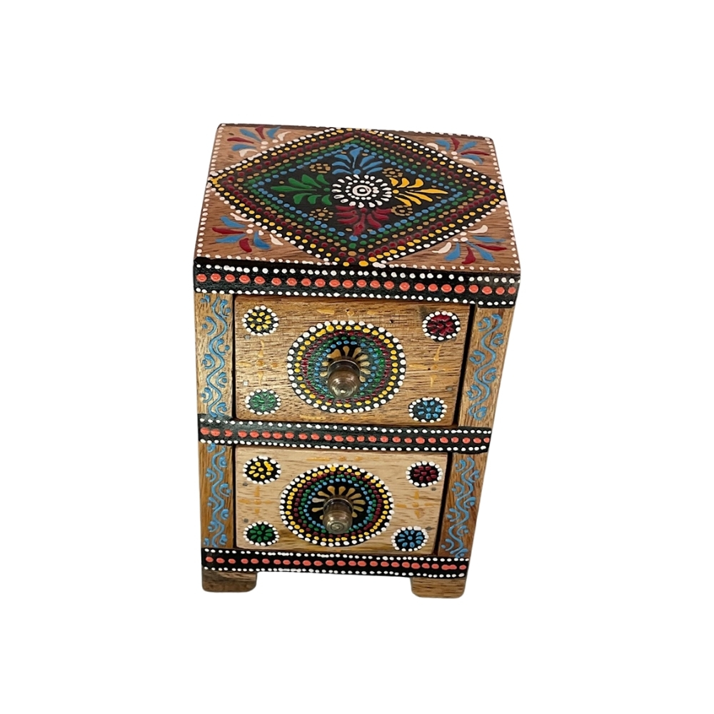 HexaFolk Tall Wooden Cabinet stands out with its unique hexagonal form and hand-painted folk artwork. Made from durable wood, it provides vertical storage with a strong decorative presence. A perfect statement piece for artistic interiors.