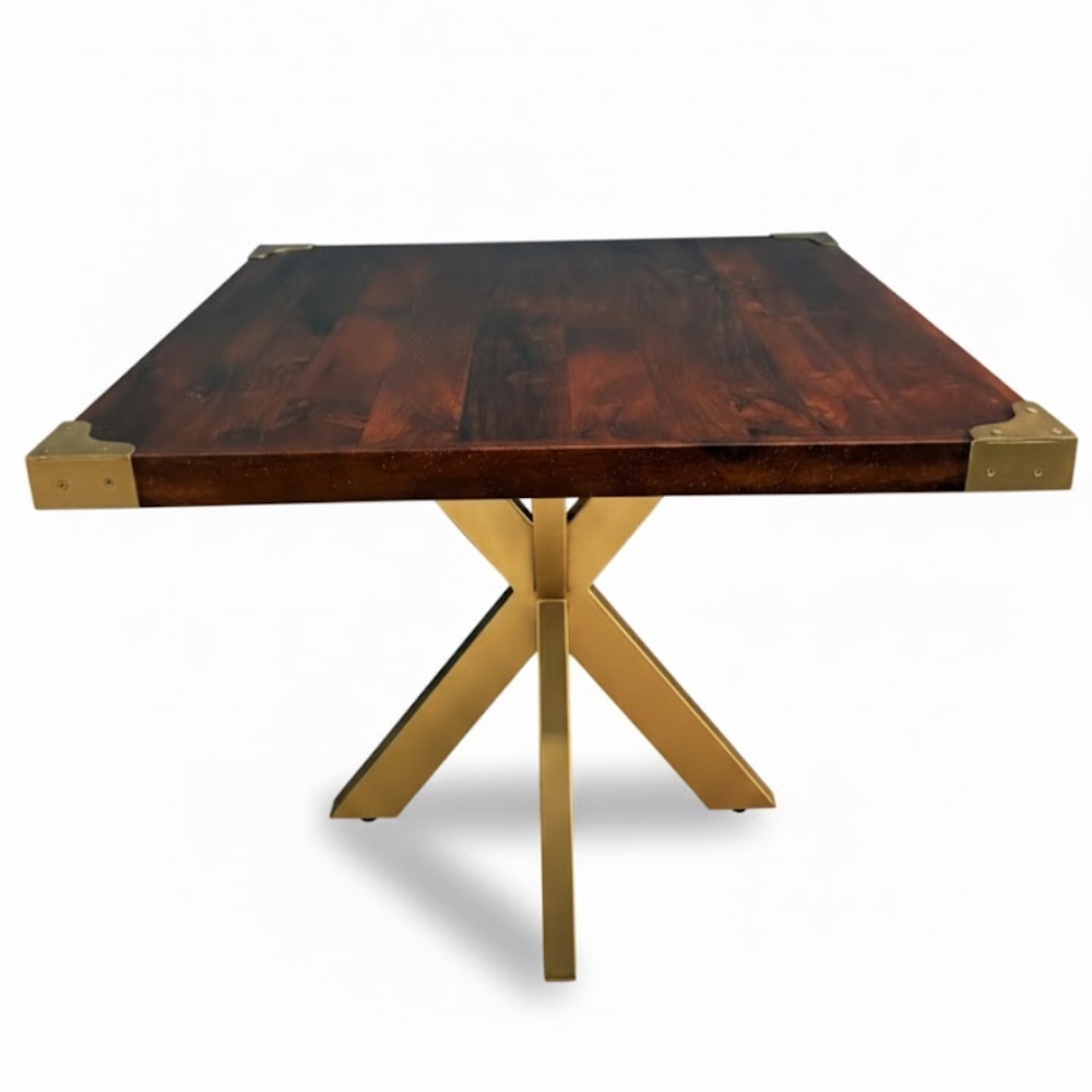 The Imperial Cross Dining Table features a richly finished wooden top supported by an elegant cross-style metal base in a premium finish. Designed for statement dining areas and luxury restaurants.