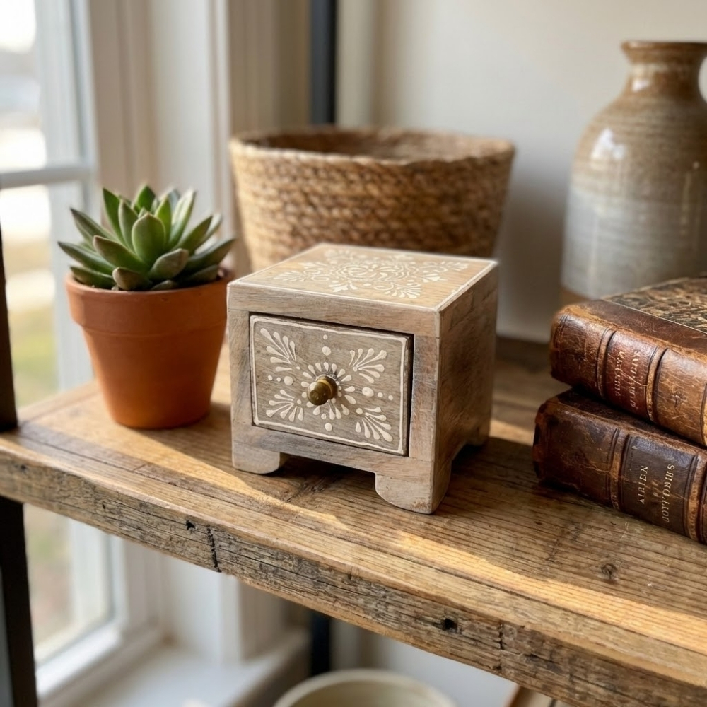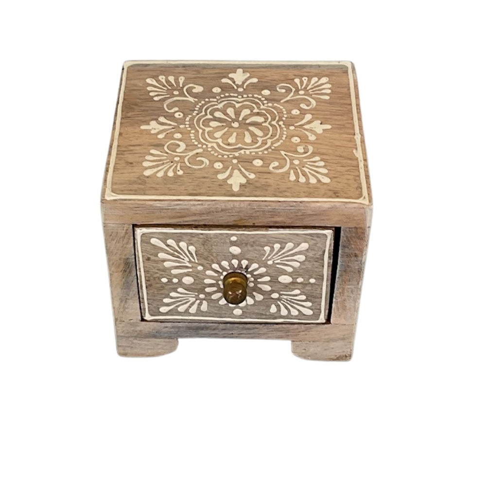 This handcrafted wooden drawer box features soft ivory tones and delicate floral detailing. Built from solid wood, it offers compact storage for jewellery or essentials while adding a calm, elegant touch to home décor. Ideal for bedside tables or shelves.