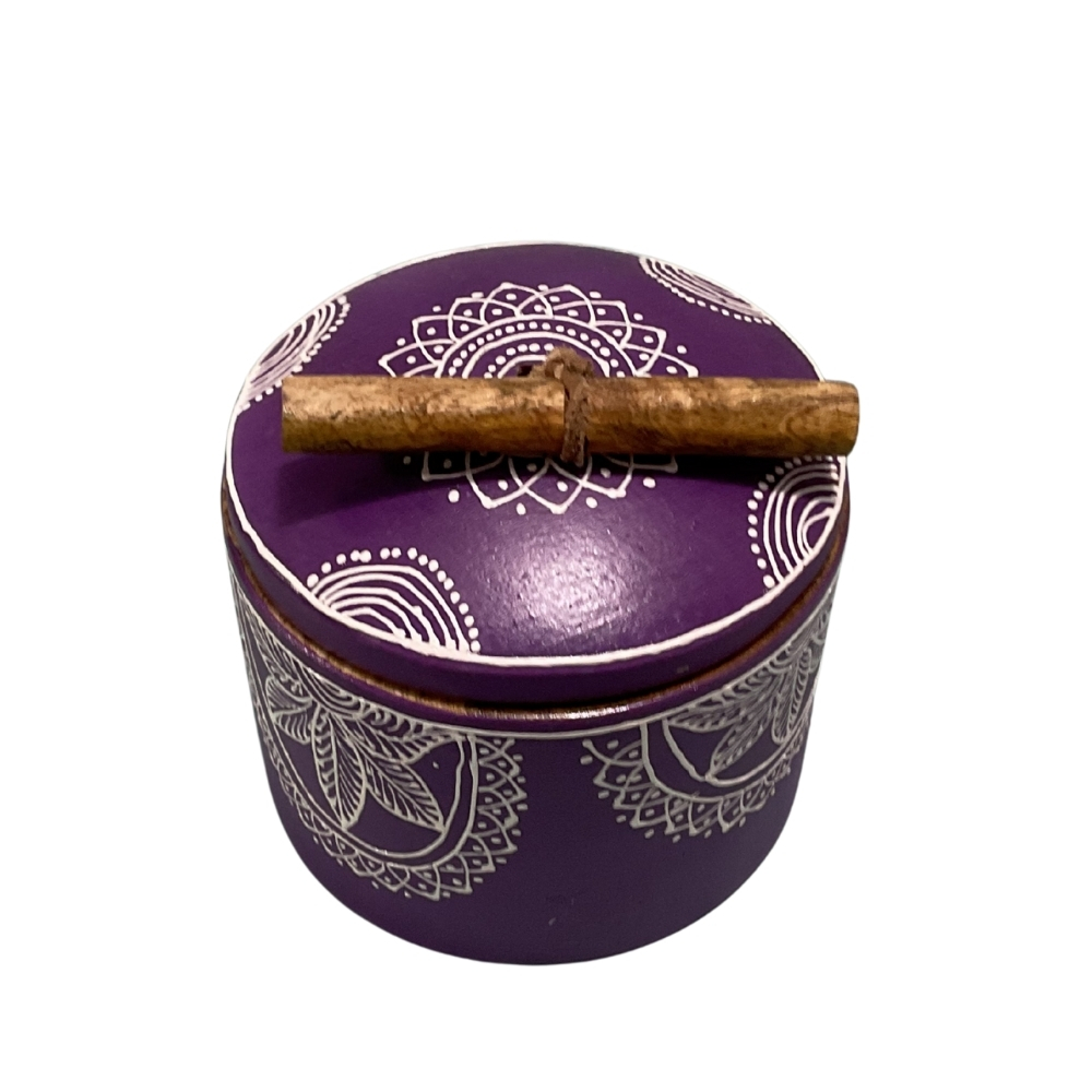 Handcrafted round wooden box with deep purple mandala folk art and wooden lid. Ideal for jewellery and décor storage.