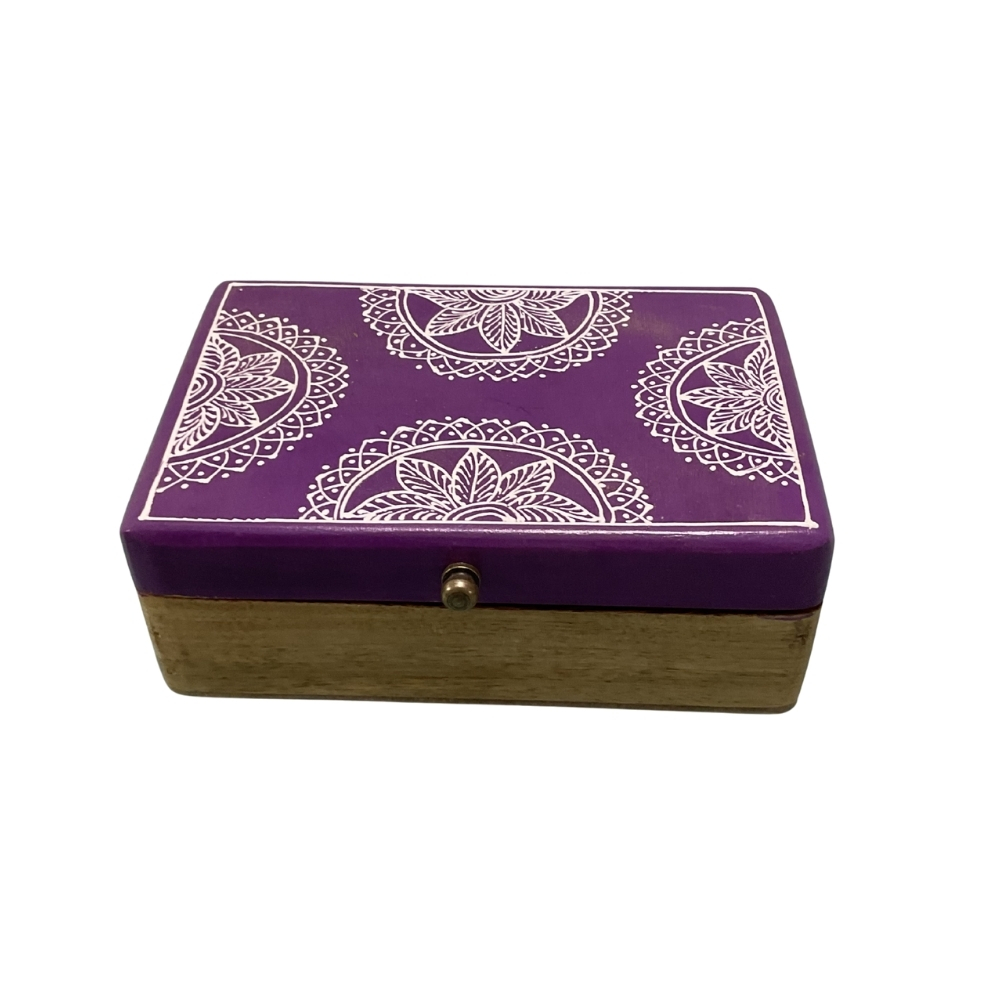 The JamuniRecta Wooden Jewellery Box combines a clean rectangular form with rich purple folk mandala artwork. Crafted from high-quality wood, it features a polished surface and secure closure for everyday use.