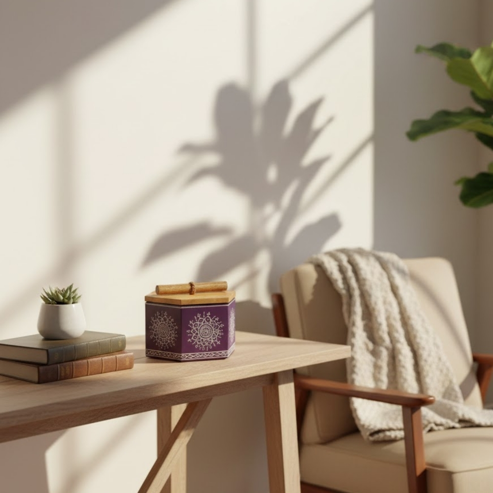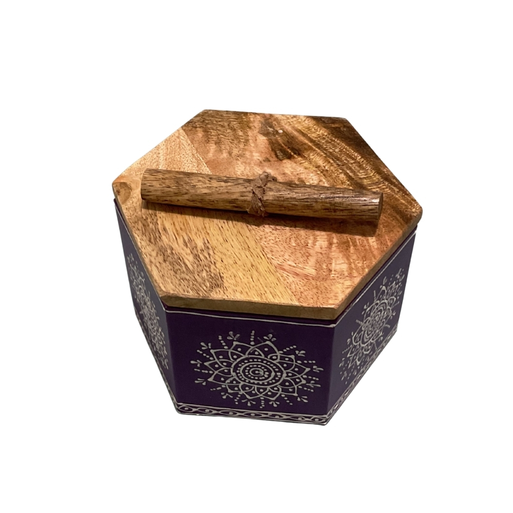 The JamuniShatkon Heritage Box reflects timeless craftsmanship through its hexagonal design and detailed purple folk artwork. Made from solid wood, it features a smooth wooden lid that complements its rich hand-painted finish.