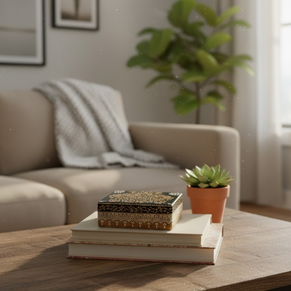 The KaalChitra Royal Black Wooden Box is a statement piece inspired by regal Indian craftsmanship. Made from solid natural wood, this box features rich black tones enhanced with intricate hand-painted gold folk patterns that give it a luxurious, heritage feel.
