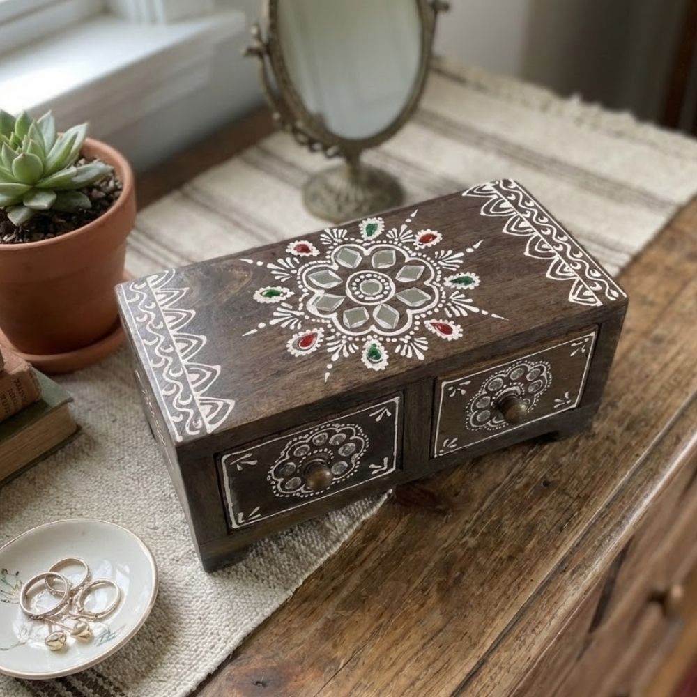 This square wooden box is decorated with a central mandala pattern symbolizing harmony and balance. Crafted from solid wood, it provides secure storage for jewellery, keepsakes, or accessories. Its artistic detailing makes it suitable as both a functional box and a decorative centerpiece.