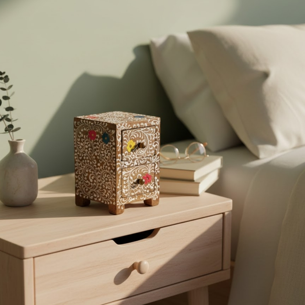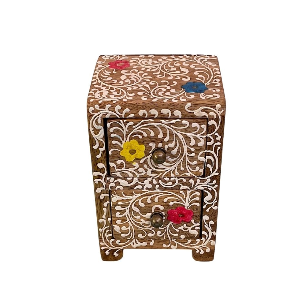 MiniHeritage Drawer Chest is designed for small-space storage while showcasing classic folk-art craftsmanship. Its solid wood construction and detailed patterns make it both practical and visually appealing.