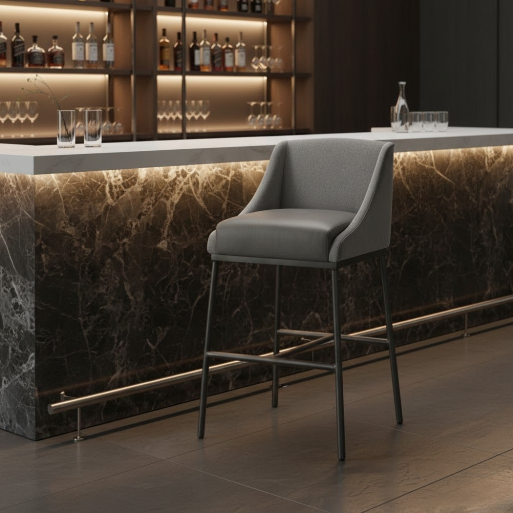 Its slim yet sturdy metal legs provide excellent stability while maintaining a light, elegant profile. The soft fabric upholstery paired with a minimalist structure makes this stool ideal for premium home bars, hotel lounges, cafés, and upscale commercial interiors.