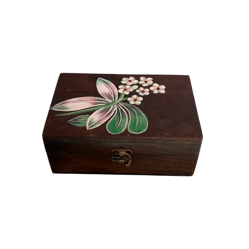 Hand-painted wooden box featuring soft floral and leaf artwork with secure metal latch. Ideal for jewellery, keepsakes, gifting, and elegant home décor.