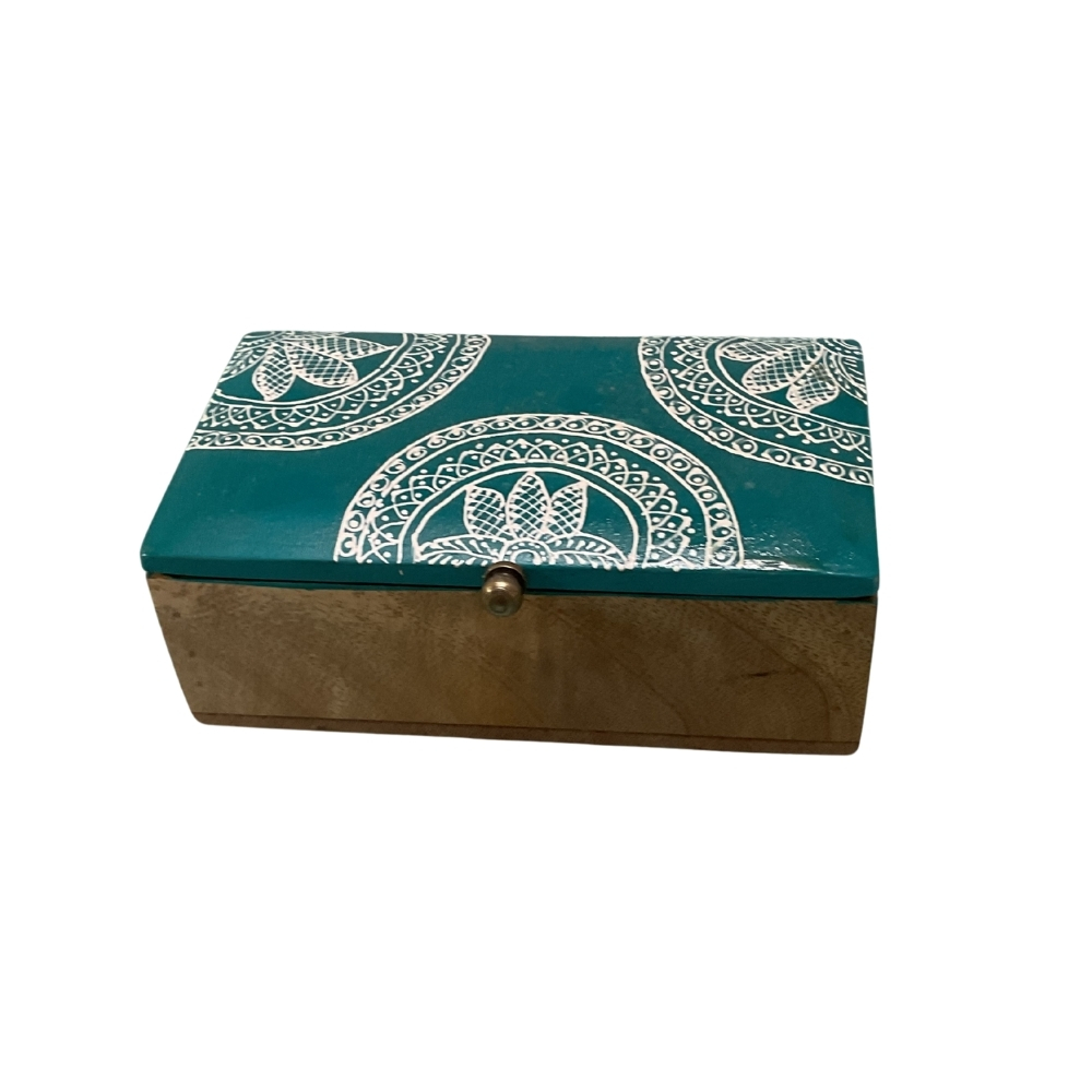 The NeelArdhaMandala Wooden Box features a soothing teal color with half-mandala inspired folk art on its lid. Crafted from solid wood, it blends traditional hand-painting with a minimal modern form.