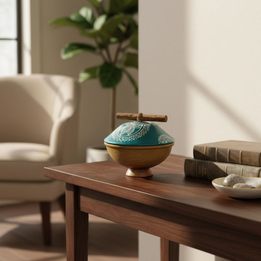 The NeelKosha Handcrafted Round Box is a charming storage solution inspired by traditional folk art. Crafted from solid wood, it features elegant teal patterns and a smooth wooden lid with a handle for easy access.