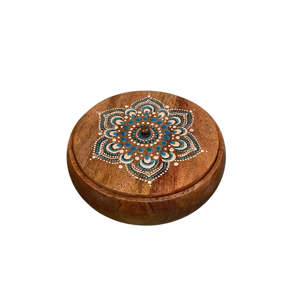 Add serenity and handcrafted elegance to your space with this artistic round wooden mandala box.
