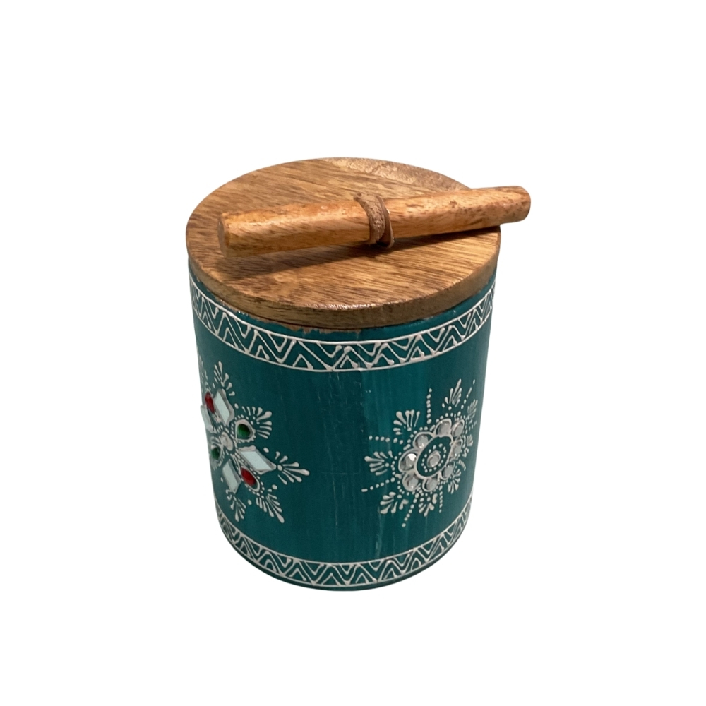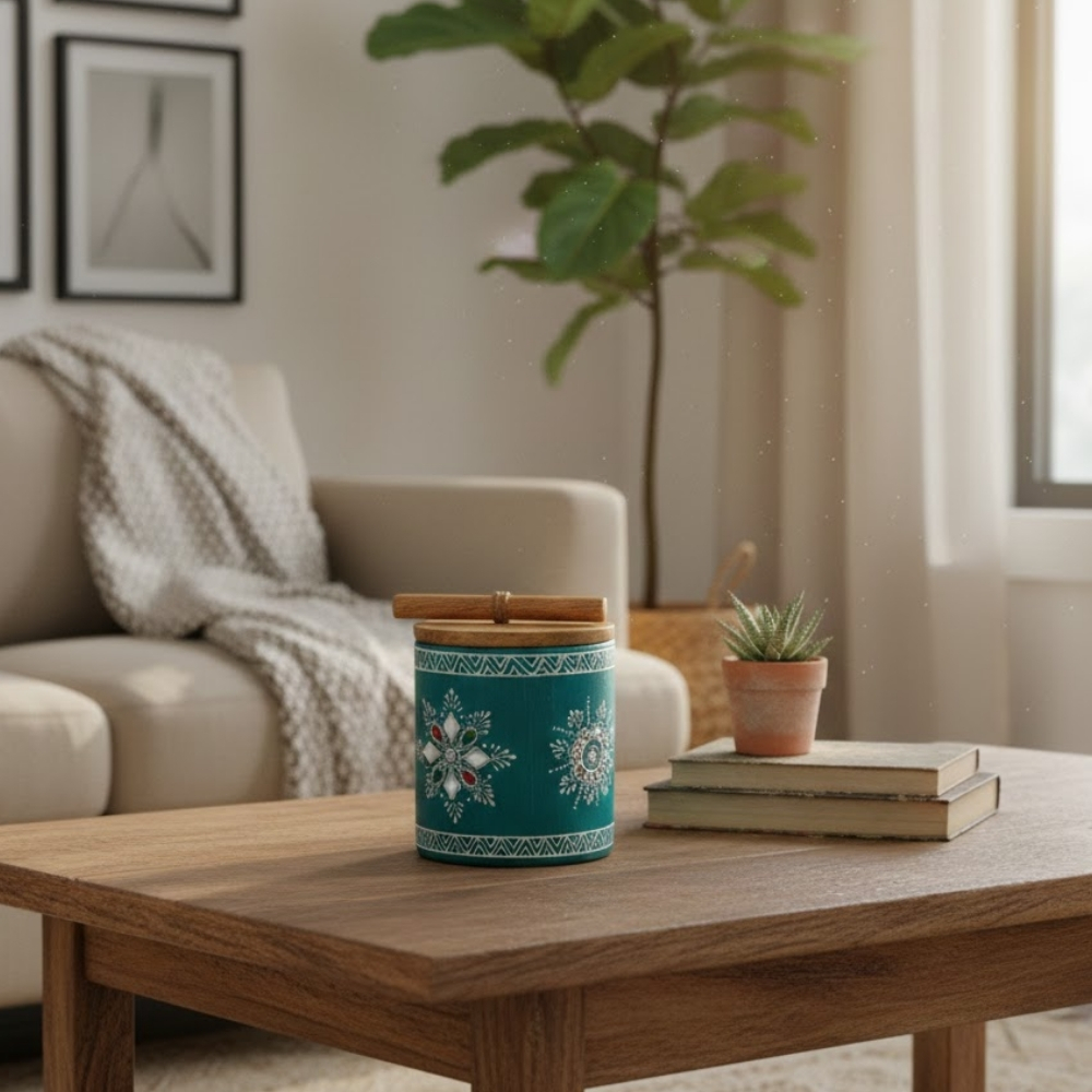 The NeelVana Round Wooden Jar is a beautifully crafted storage piece designed for both utility and style. Made from natural wood, it features elegant teal folk artwork paired with a smooth wooden lid that adds warmth and contrast.