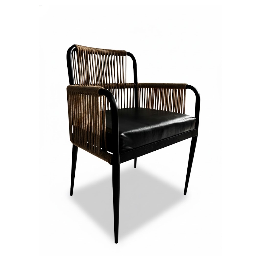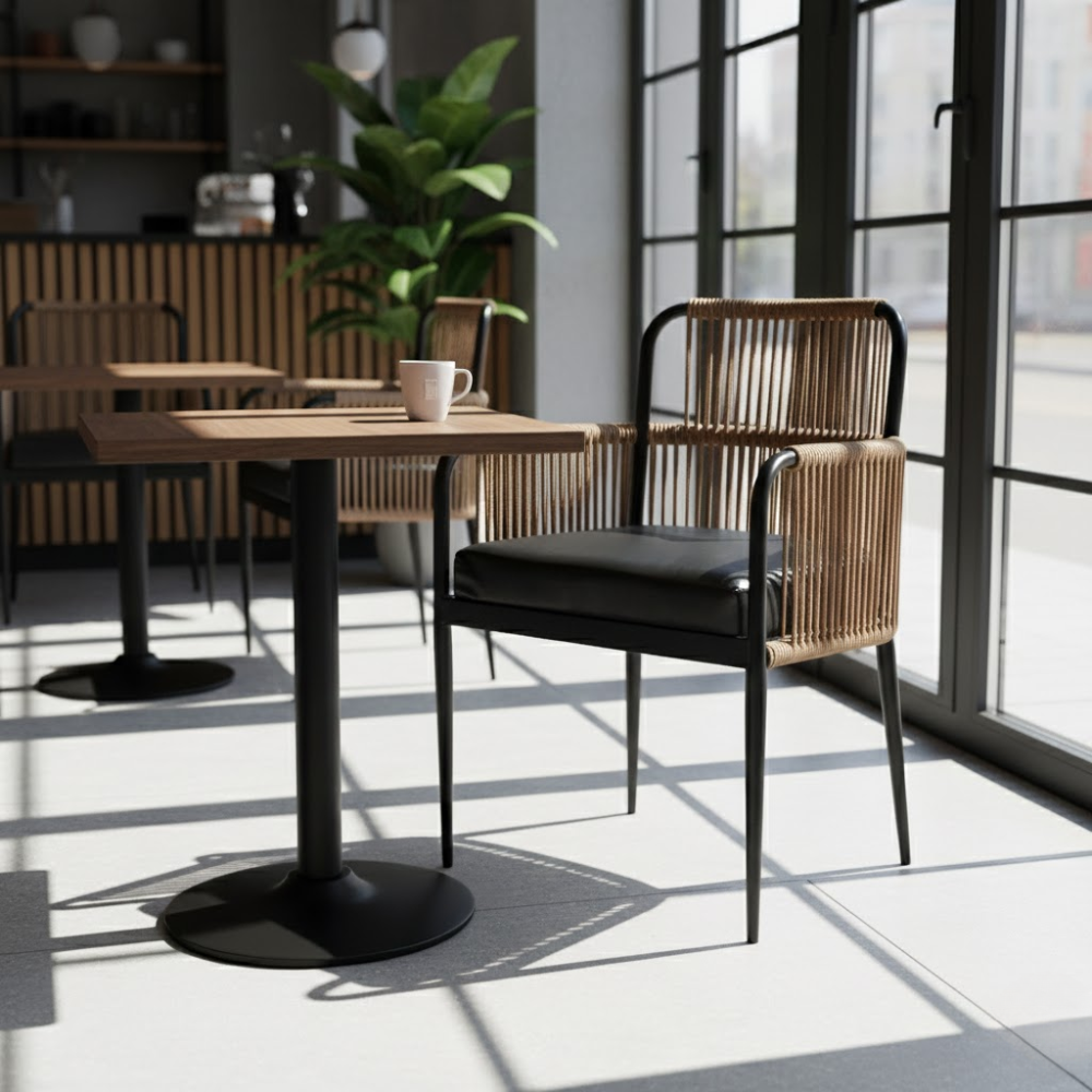 This variant of the Nyxera Polven Trassiq Dining Armchair features an elegant ivory cushion that adds a lighter, more refined visual appeal. Built on the same durable iron structure, it offers superior comfort and durability, making it ideal for premium restaurants, hotels, and modern dining spaces.
