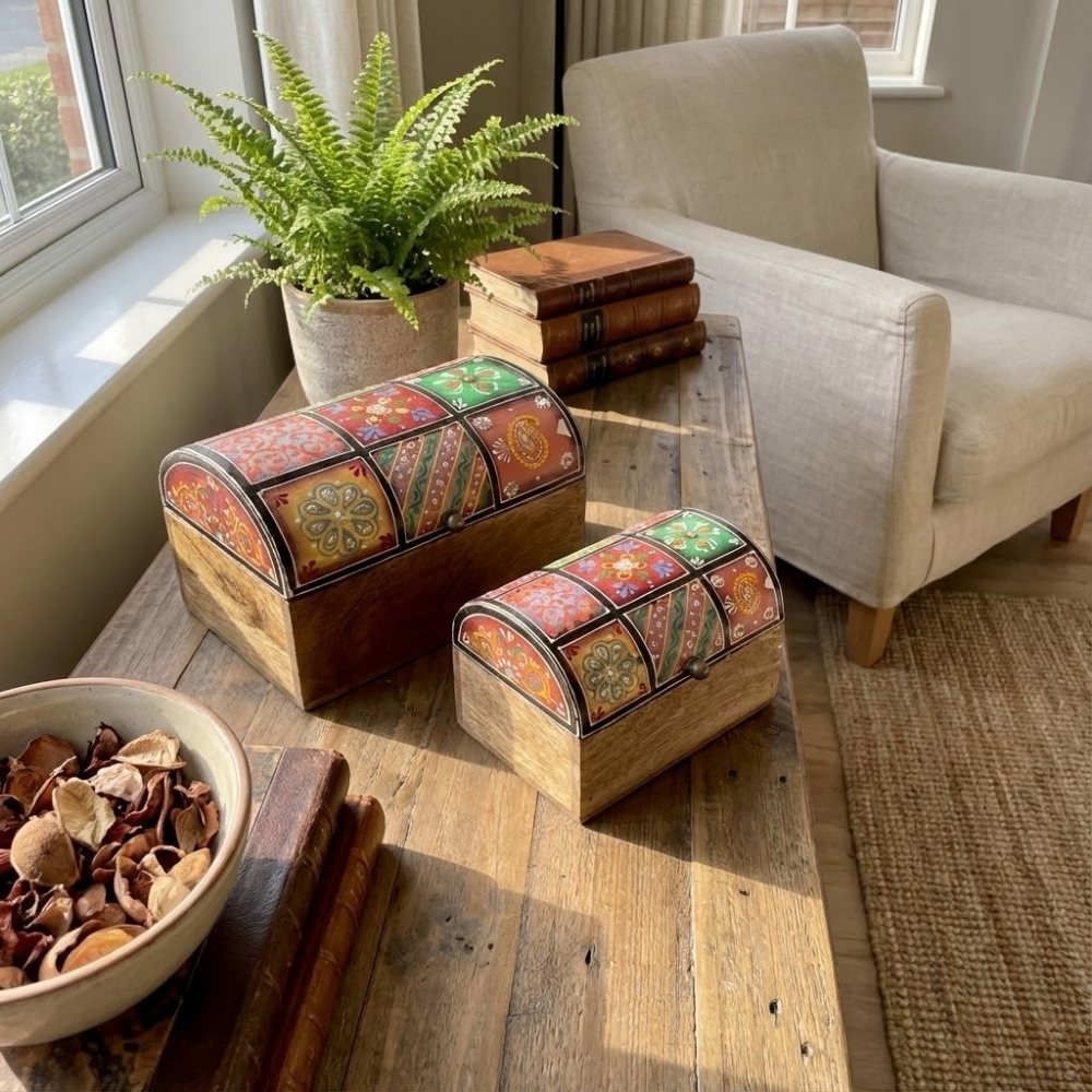 Perfect for storing jewellery, bangles, accessories, keepsakes, or pooja items, this wooden chest set also works wonderfully as a decorative accent for living rooms, bedrooms, or festive displays. Its vibrant ethnic appeal makes it an excellent gifting option for weddings, Diwali, housewarmings, anniversaries, or return gifts.