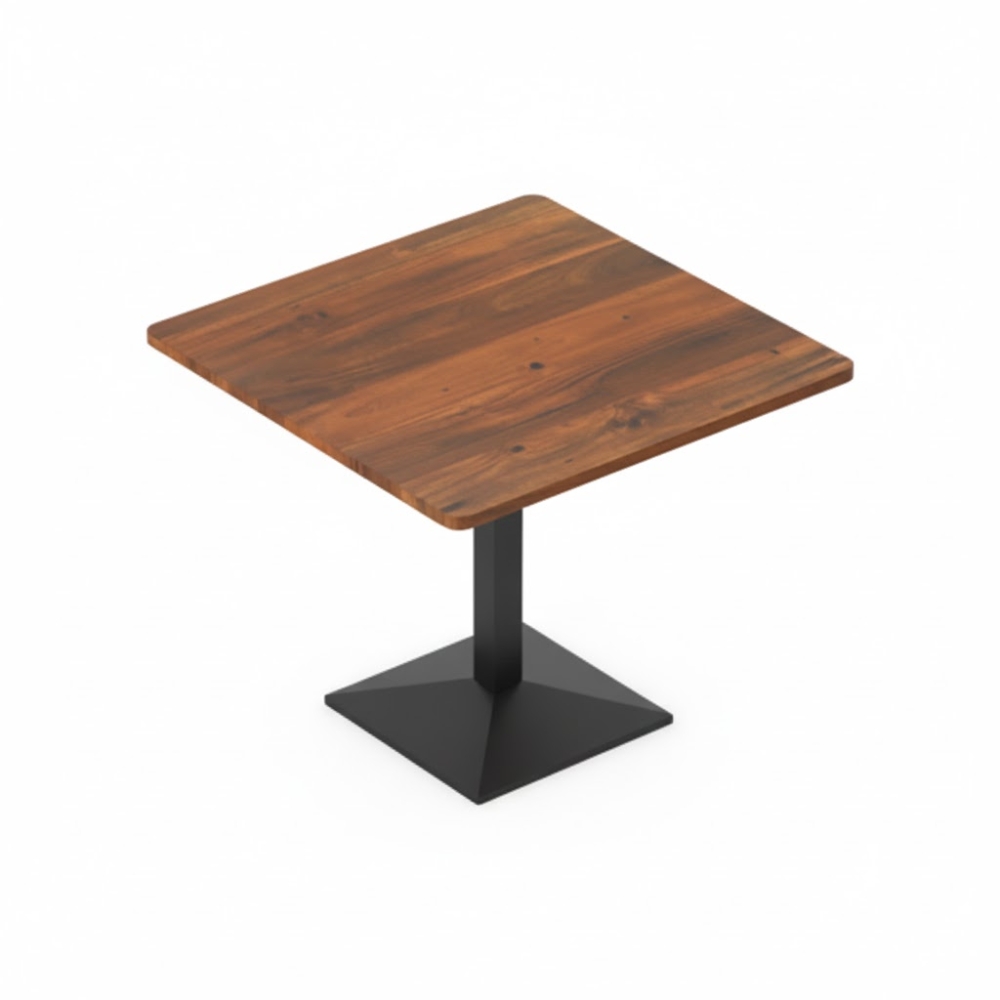 A rustic square café table with a minimalist pedestal design.