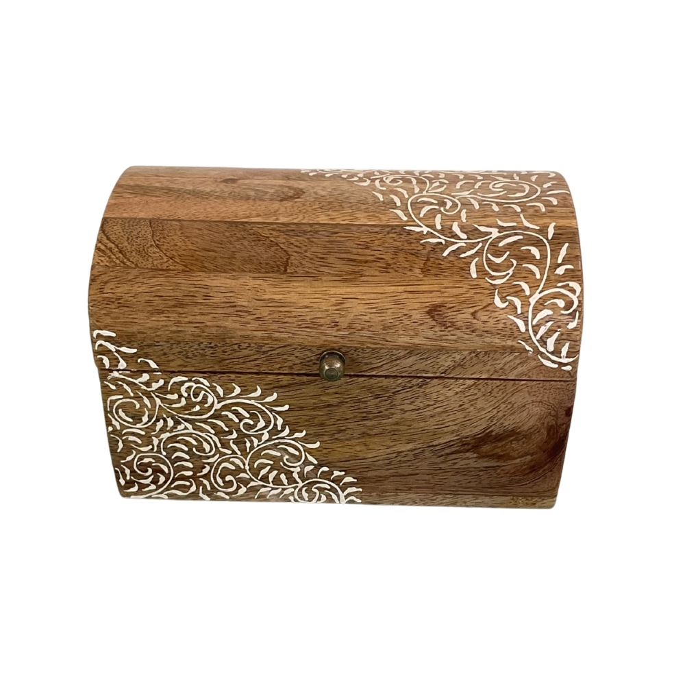 Elegant handcrafted wooden chest with subtle white vine artwork. Ideal for jewellery, keepsakes, gifting, and modern ethnic home décor.