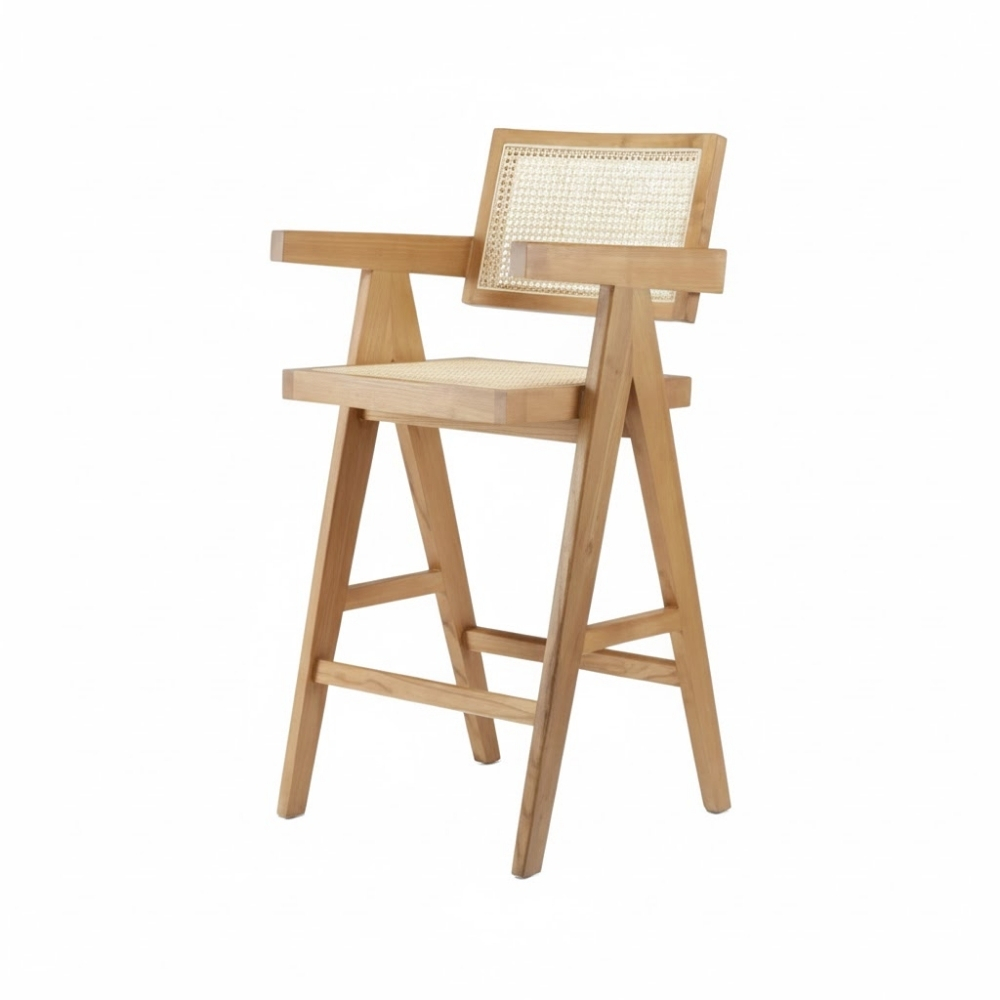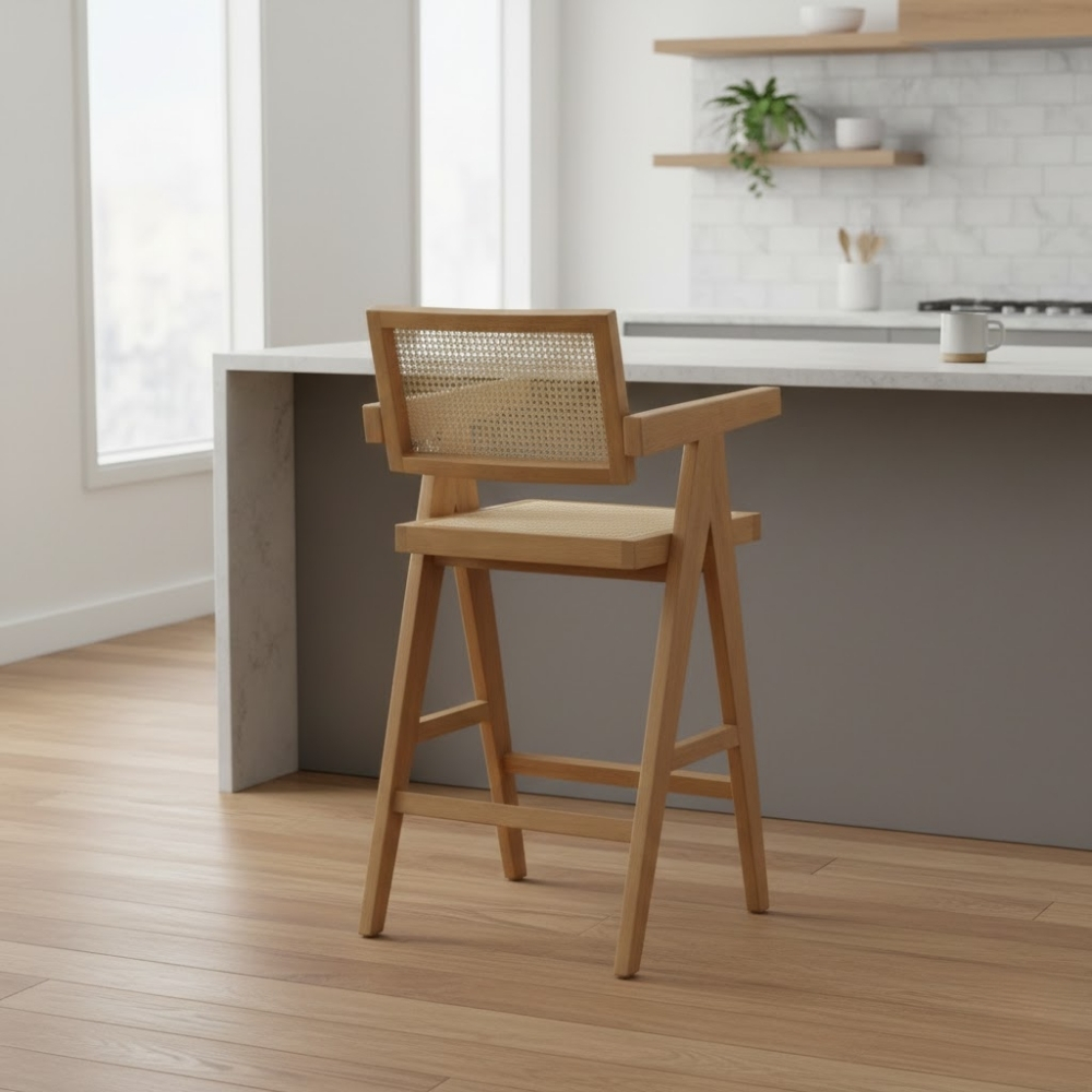 Its structured armrests, angled legs, and integrated footrest ensure a stable and relaxed seating posture, even during extended use. The warm wooden tone paired with minimalist cane detailing makes it an excellent choice for kitchen islands, home bars, cafés, and upscale hospitality interiors.