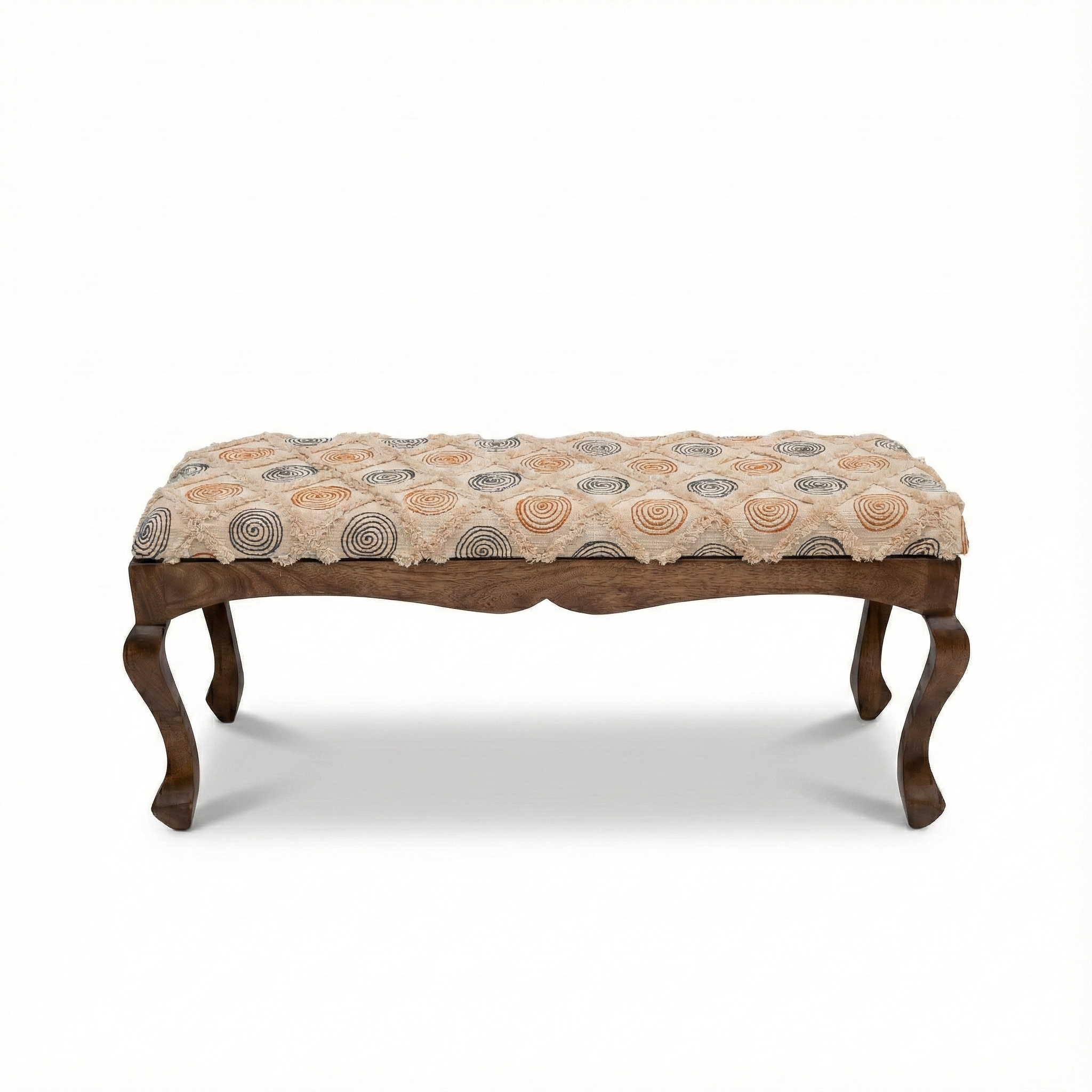 This elegant tufted bench features a unique embroidered spiral pattern on a durable fabric top, adding texture and style to any room. The beautifully curved, dark wood legs provide stable support and a classic, sophisticated look. Its cushioned seat offers comfortable extra seating for an entryway, bedroom, or living area. Crafted with high-quality materials, this versatile bench is a perfect accent piece for your home.