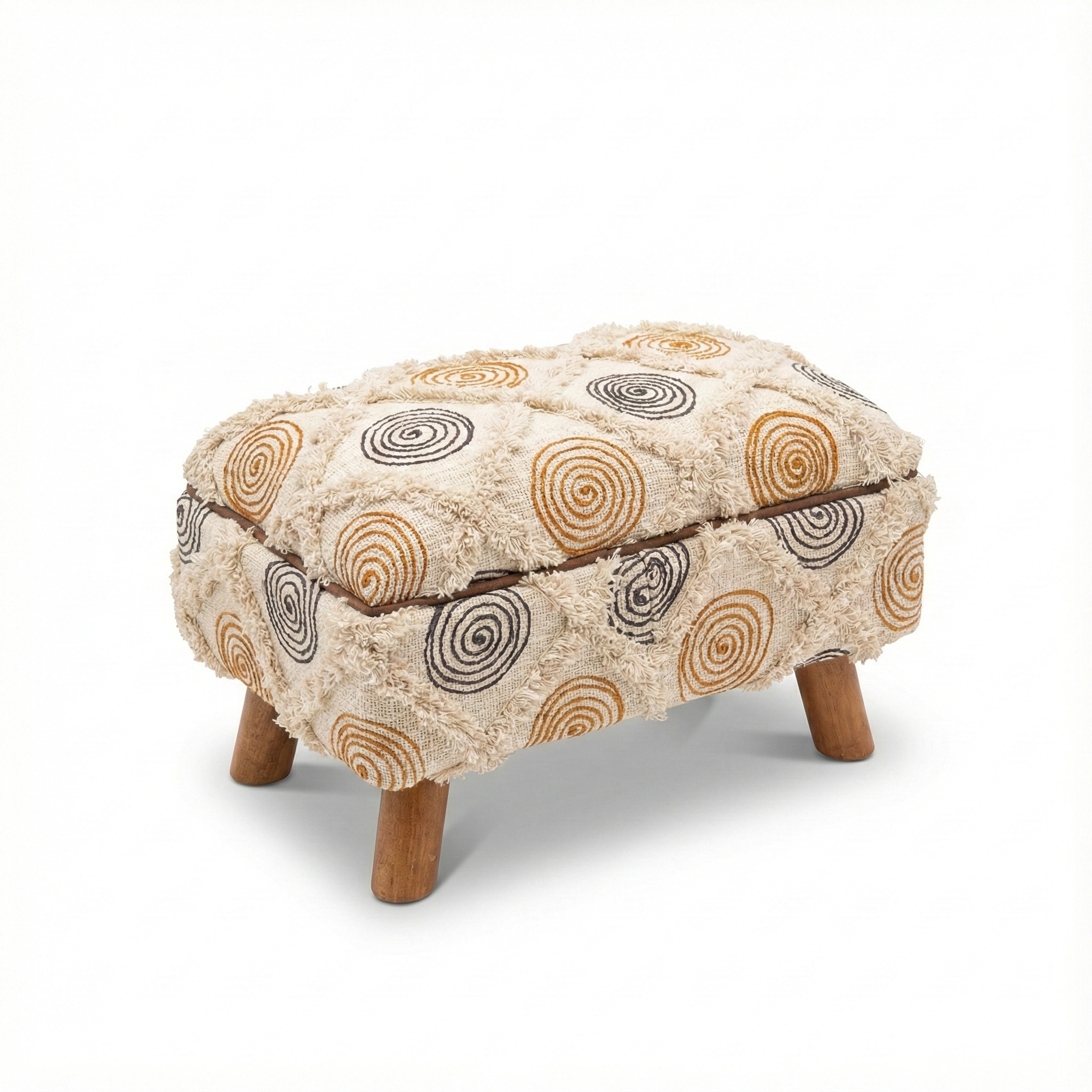 Add a touch of texture and style to your living space with this unique footstool. It features a durable cotton-blend fabric with a distinctive embroidered spiral pattern and soft, fringed edges. The cushioned top provides a comfortable place to rest your feet, while the solid wood legs ensure lasting stability. This versatile piece is perfect for use as a footrest, extra seating, or a stylish accent in any room.