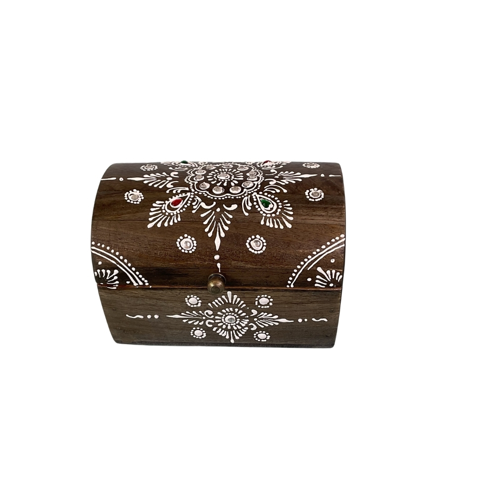 The VanyaPushp Curved Wooden Chest features a graceful dome-shaped design combined with intricate white floral hand-painted patterns. Made from solid natural wood, this chest-style box adds a classic, vintage appeal to any space.