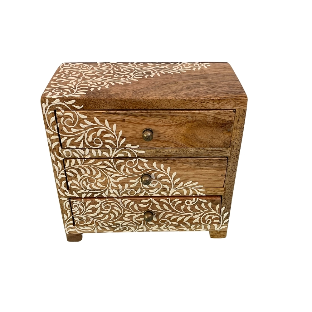 VintageVine Wooden Drawer Box is inspired by classic vine patterns commonly found in traditional woodcraft. Made from high-quality solid wood, this box features flowing floral carvings that wrap elegantly around its surface. The drawer provides easy access and organized storage for small essentials such as jewelry, keys, watches, or stationery. Its sturdy construction ensures stability and durability, while the hand-polished finish gives it a refined appearance. This drawer box fits beautifully on coffee tables, desks, or bedside units. Each piece is crafted by skilled artisans, making every unit unique in detail and texture. VintageVine Wooden Drawer Box adds timeless charm and functional beauty to any space.